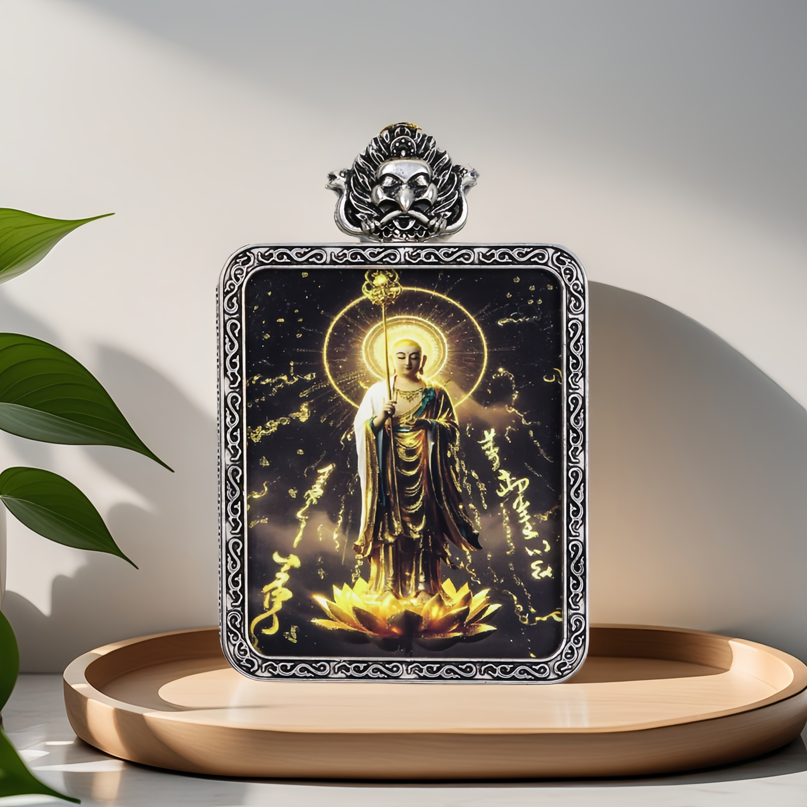 Black and gold Buddhist amulet Thangka, purely handmade, with a metal tray, exquisite painting style.