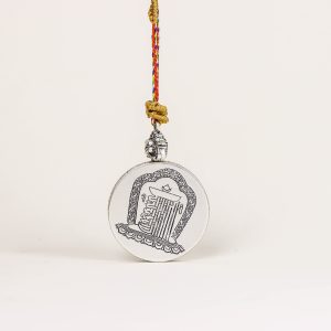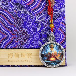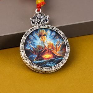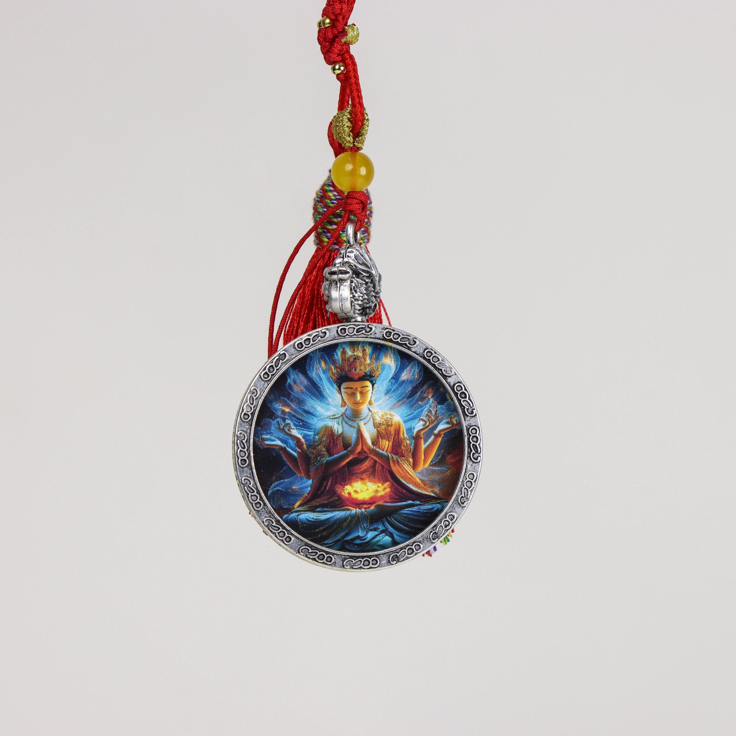 Hand-painted, Ksitigarbha Bodhisattva image, beautiful. Metal tray included, comes with a red string (round pendant).
